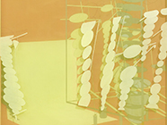 Composés sur deux plans parallèles assemblés dans un châssis en bois dont l'un des cotés est transparent. Les dessins sont composés d'après Antichambre, 2011, oeuvre spatiale mise en rotation par un moteur. Chaque tableau est un moment d'arrêt sur ce mouvement, les couleurs perceptibles ne résultent pas d'un mélange pigmentaire, mais de la fusion optique par transparence des différentes teintes. |